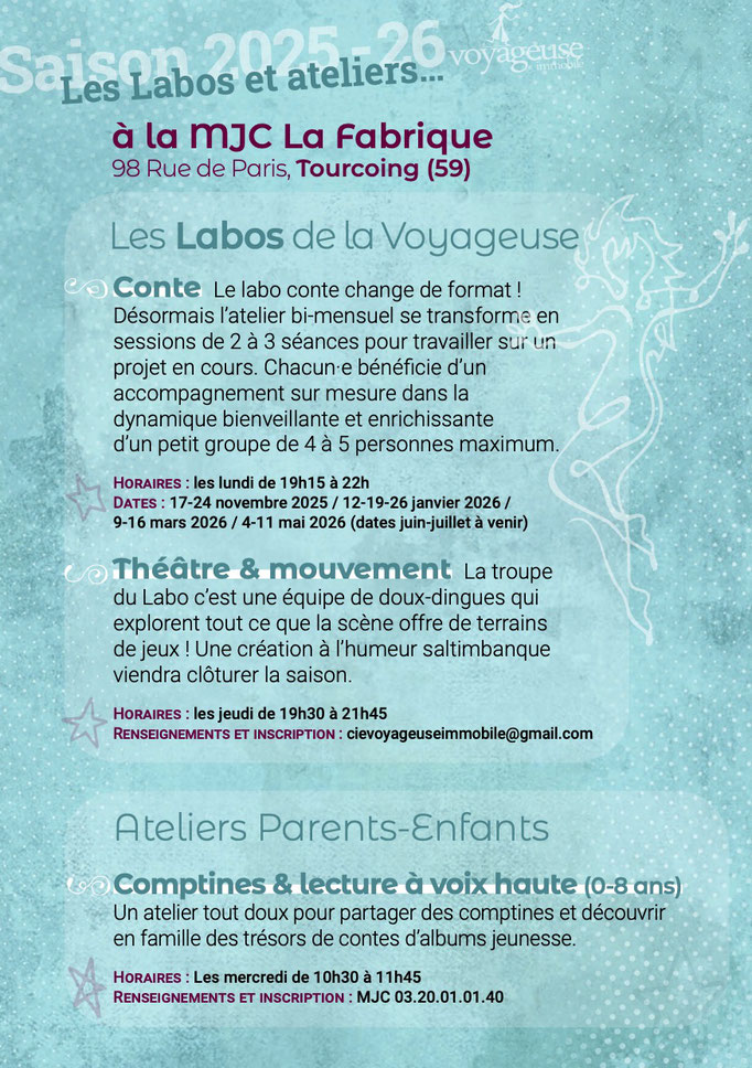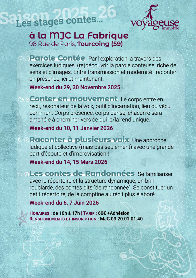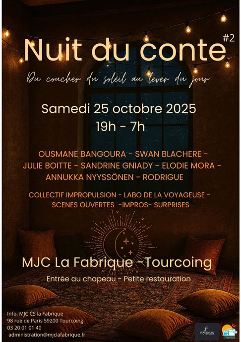 La Voyageuse se réjouit de vous accueillir pour la 2ème Nuit du conte, le samedi 25 octobre à partir de 19h à la MJC La Fabrique (Tourcoing).
