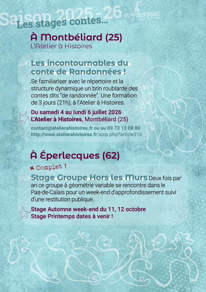 Se familiariser avec le répertoire et la structure dynamique un brin roublarde des contes dits “de randonnée”. Une formation